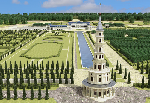 К сожалению существоваший здесь замок не дожил до наших дней, оставив нам в качестве свидетеля эпохи эту башню, пагоду, фантазийное архитектурное сооружение 18 века.